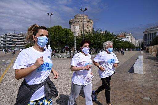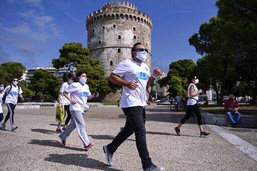 A few dozen people fast-walked and ran 2 kilometers (1.25 miles) through central Thessaloniki while wearing face masks and then measured their oxygen and carbon dioxide levels, finding them all normal.