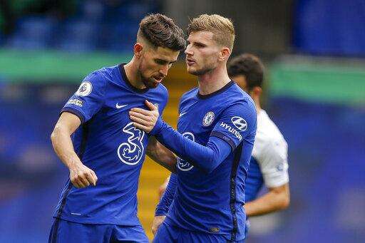 Chelsea's Jorginho, left, celebrates with his teammate Timo Werner after he scored his side's fourth goal during the English Premier League soccer match between Chelsea and Crystal Palace at Stamford Bridge stadium in London, Saturday, Oct. 3, 2020. (AP Photo/Kirsty Wigglesworth, Pool) The Associated Press