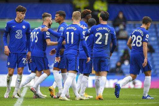 Chelsea players celebrate after their teammate Chelsea's Jorginho scored his side's fourth goal during an English Premier League soccer match between Chelsea and Crystal Palace at Stamford Bridge stadium in London, Saturday, Oct. 3, 2020. (Mike Hewitt/ Pool via AP) The Associated Press