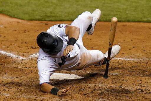 Miami Marlins' Francisco Cervelli celebrates his three-run home run against the Toronto Blue Jays during the ninth inning of a baseball game Tuesday, Aug. 11, 2020, in Buffalo, N.Y. (AP Photo/Jeffrey T. Barnes) The Associated Press