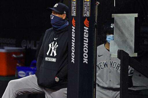 FILE - In this Tuesday, Sept. 29, 2020, file photo, New York Yankees manager Aaron Boone watches from the dugout in the sixth inning of Game 1 of an American League wild-card baseball series against the Cleveland Indians in Cleveland. (AP Photo/David Dermer, File) The Associated Press