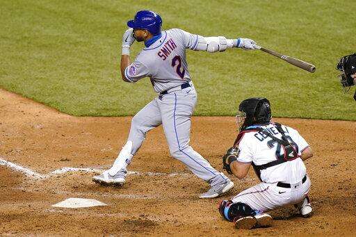 New York Mets' Dominic Smith (2) follows through on a double to score Michael Conforto as Miami Marlins catcher Francisco Cervelli (29) looks on during the eighth inning of a baseball game, Wednesday, Aug. 19, 2020, in Miami. (AP Photo/Lynne Sladky) The Associated Press