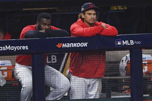 Cleveland Indians' Josh Naylor, right, and Franmil Reyes watch from the dugout after the Indians lost 10-9 to the New York Yankees in Game 2 of an American League wild-card baseball series, early Thursday, Oct. 1, 2020, in Cleveland. (AP Photo/David Dermer) The Associated Press