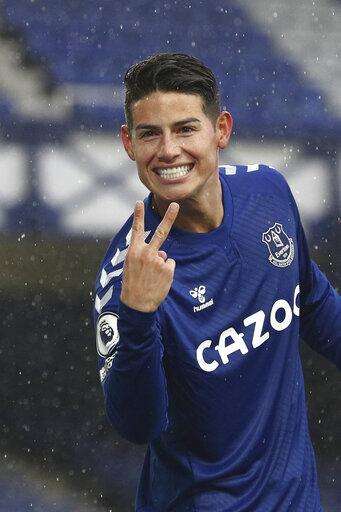 Everton's James Rodriguez celebrates after scoring his side's third goal during the English Premier League soccer match between Everton and Brighton at the Goodison Park stadium in Liverpool, England, Saturday, Oct. 3, 2020. (Jan Kruger/Pool via AP) The Associated Press