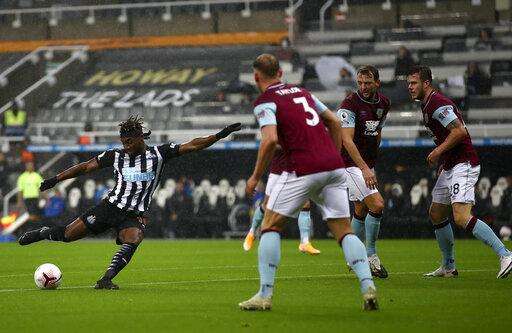 Newcastle's Allan Saint-Maximin, left, scores his side's opening goal during the English Premier League soccer match between Newcastle United and Burnley at St. James' Park in Newcastle, England, Saturday, Oct. 3, 2020. (Alex Pantling/Pool via AP) The Associated Press