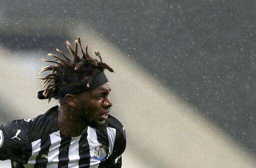 Newcastle's Allan Saint-Maximin celebrates after scoring his side's opening goal during the English Premier League soccer match between Newcastle United and Burnley at St. James' Park in Newcastle, England, Saturday, Oct. 3, 2020. (AP Photo/Scott Heppell, Pool) The Associated Press