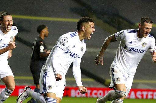 Leeds United's Rodrigo, center, celebrates after scoring his side's first goal during the English Premier League soccer match between Leeds United and Manchester City at Elland Road in Leeds, England, Saturday, Oct. 3, 2020. (Cath Ivill/Pool via AP) The Associated Press
