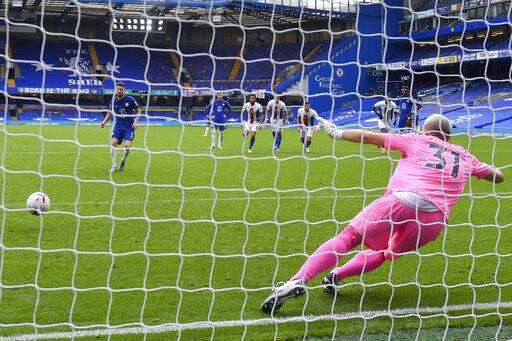Chelsea's Jorginho, left, scores his side's third goal on a penalty kick during an English Premier League soccer match between Chelsea and Crystal Palace at Stamford Bridge stadium in London, Saturday, Oct. 3, 2020. (Mike Hewitt/ Pool via AP) The Associated Press