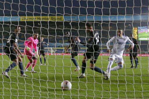 Leeds United's Rodrigo right, scores his side's first goal during the English Premier League soccer match between Leeds United and Manchester City at Elland Road in Leeds, England, Saturday, Oct. 3, 2020. (Jason Cairnduff/Pool via AP) The Associated Press
