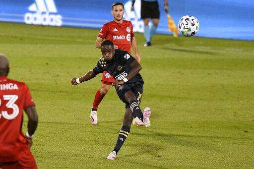 Philadelphia Union's Jamiro Monteiro, center, takes a shot on goal during the first half of an MLS soccer match against Toronto FC, Saturday, Oct. 3, 2020, in East Hartford, Conn. (AP Photo/Jessica Hill) The Associated Press
