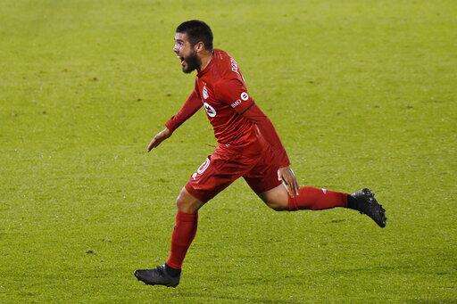 Toronto FC's Alejandro Pozuelo celebrates his goal during the second half of an MLS soccer match against the Philadelphia Union, Saturday, Oct. 3, 2020, in East Hartford, Conn. (AP Photo/Jessica Hill) The Associated Press