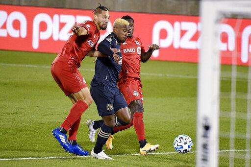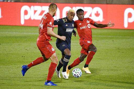 Philadelphia Union's Sergio Santos, center, cuts between Toronto FC's Omar Gonzalez, left, and Richie Laryea to score a goal during the first half of an MLS soccer match Saturday, Oct. 3, 2020, in East Hartford, Conn. (AP Photo/Jessica Hill) The Associated Press