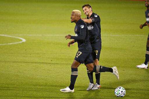 Philadelphia Union's Sergio Santos celebrates his goal with teammate Alejandro Bedoya, right, during the first half of an MLS soccer match against Toronto FC, Saturday, Oct. 3, 2020, in East Hartford, Conn. (AP Photo/Jessica Hill) The Associated Press