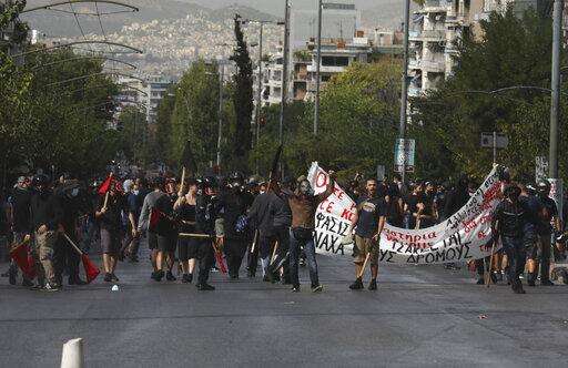 Protesters stand during scuffles in part of an anti-fascist rally, outside the courthouse in Athens, following the announcement of its verdict, Wednesday, Oct. 7, 2020. The court has ruled the far-right Golden Dawn party was operating as a criminal organization, delivering landmark guilty verdicts in a politically charged five-year trial against dozens of defendants, including former lawmakers of what had become Greece's third largest party. The marathon trial had been assessing four cases rolled into one: the 2013 fatal stabbing of Greek rap singer Pavlos Fyssas, attacks on migrant fishermen in 2012, attacks on left-wing activists in 2013 and whether Golden Dawn was operating as a criminal organization.(AP Photo/Yorgos Karahalis)