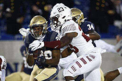 Navy's C.J. Williams carries the ball as Temple's Jordan McGee moves in for the tackle during the first half of an NCAA college football game Saturday, Oct. 10, 2020, in Annapolis, Md. (AP Photo/Gail Burton) The Associated Press