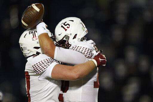 Temple's Anthony Russo, right, celebrates his touchdown against Navy with Michael Niese during the first half of an NCAA college football game Saturday, Oct. 10, 2020, in Annapolis, Md. (AP Photo/Gail Burton) The Associated Press