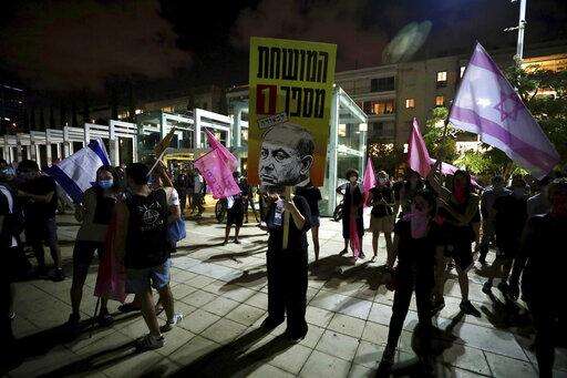 TEL AVIV, Israel (AP) - Tens of thousands of Israelis calling on Prime Minister Benjamin Netanyahu to resign demonstrated across the country Saturday evening, saying he is unfit to rule while on trial for corruption charges and accusing him of mismanaging the nation's coronavirus crisis.