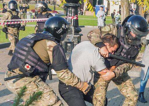Police detain a protester during a rally to support former region's governor Sergei Furgal in Khabarovsk, 6,100 kilometers (3,800 miles) east of Moscow, Russia, Saturday, Oct. 10, 2020. Police in a far eastern Russian city have detained several dozen protesters in the first such crackdown since rallies against the arrest of the provincial governor started three months ago. Khabarovsk Gov. Sergei Furgal was arrested on July 9 on suspicion of involvement in murders and taken to jail in Moscow. (AP Photo/Igor Volkov) The Associated Press