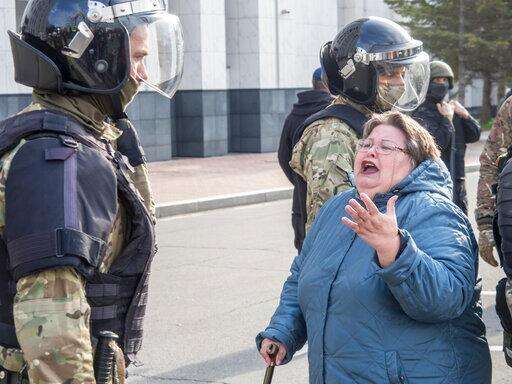 A woman talks to police during a rally to support former region's governor Sergei Furgal in Khabarovsk, 6,100 kilometers (3,800 miles) east of Moscow, Russia, Saturday, Oct. 10, 2020. Police in a far eastern Russian city have detained several dozen protesters in the first such crackdown since rallies against the arrest of the provincial governor started three months ago. Khabarovsk Gov. Sergei Furgal was arrested on July 9 on suspicion of involvement in murders and taken to jail in Moscow. (AP Photo/Igor Volkov) The Associated Press