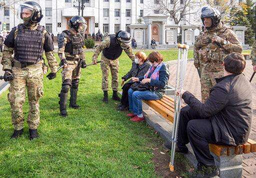 Police tell people to leave the square in front of regional government building during a rally to support former region's governor Sergei Furgal in Khabarovsk, 6,100 kilometers (3,800 miles) east of Moscow, Russia, Saturday, Oct. 10, 2020. Police in a far eastern Russian city have detained several dozen protesters in the first such crackdown since rallies against the arrest of the provincial governor started three months ago. Khabarovsk Gov. Sergei Furgal was arrested on July 9 on suspicion of involvement in murders and taken to jail in Moscow. (AP Photo/Igor Volkov) The Associated Press