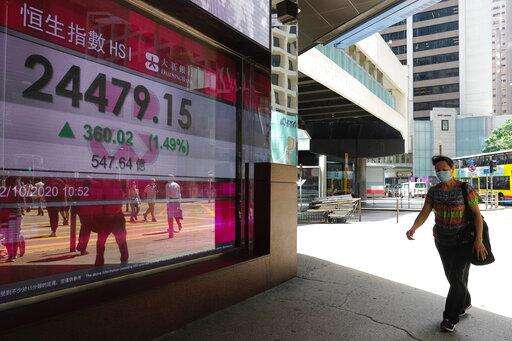 A man walks past a bank's electronic board showing the Hong Kong share index at Hong Kong Stock Exchange Monday, Oct. 12, 2020. Asian shares are mostly higher in muted trading on Monday, as worries about the pandemic keep optimism in check, despite the rally that closed out last week on Wall Street. (AP Photo/Vincent Yu) The Associated Press
