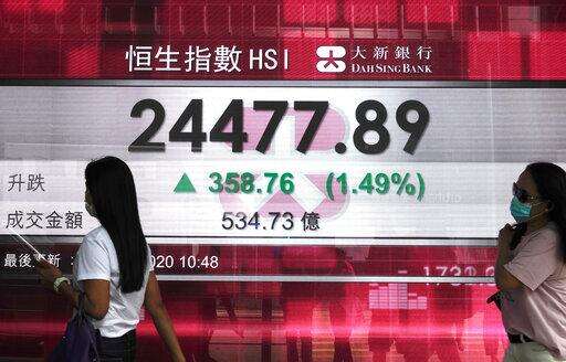 People walk past a bank's electronic board showing the Hong Kong share index at Hong Kong Stock Exchange Monday, Oct. 12, 2020. Asian shares are mostly higher in muted trading on Monday, as worries about the pandemic keep optimism in check, despite the rally that closed out last week on Wall Street. (AP Photo/Vincent Yu) The Associated Press