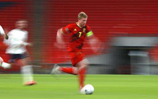 Belgium's Kevin De Bruyne runs with the ball during the UEFA Nations League soccer match between England and Belgium at Wembley stadium in London, Sunday, Oct. 11, 2020. (AP Photo/Ian Walton, Pool) The Associated Press
