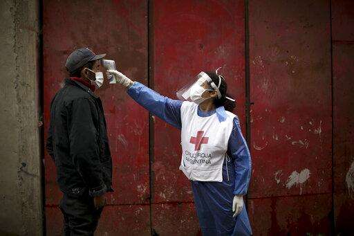 FILE - In this June 6, 2020 file photo, a Red Cross volunteer measures the temperature of man inside the Fraga slum, during a government-ordered lockdown to curb the spread of the new coronavirus, in Buenos Aires, Argentina. Argentina reached 1 million confirmed coronavirus cases on Monday, Oct. 19, 2020, according to the Ministry of Health. (AP Photo/Natacha Pisarenko, File) The Associated Press