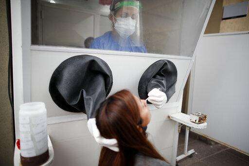 A healthcare worker takes a nasal swab sample for a for COVID-19 test from inside a freestanding isolation booth at a hospital in Buenos Aires, Argentina, Monday, Oct. 19, 2020. (AP Photo/Natacha Pisarenko) The Associated Press