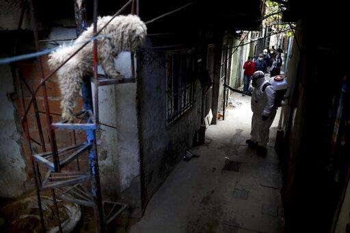 FILE - In this May 5, 2020 file photo, a dog stands on a staircase where a worker disinfects the streets of the "Villa 31" neighborhood during a government-ordered lockdown to curb the spread of the new coronavirus in Buenos Aires, Argentina. Argentina reached 1 million confirmed coronavirus cases on Monday, Oct. 19, 2020, according to the Ministry of Health. (AP Photo/Natacha Pisarenko, File) The Associated Press