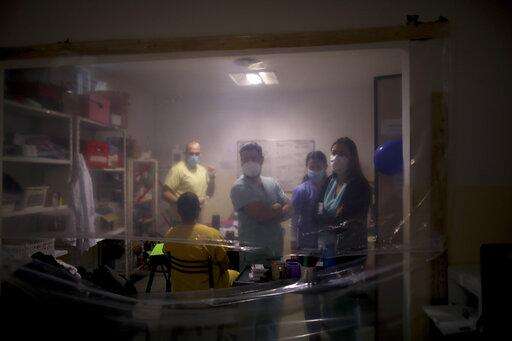 FILE - In this July 14, 2020 file photo, health care providers gather inside a work area protected by a sheet of plastic at the Eurnekian Ezeiza Hospital on the outskirts of Buenos Aires, Argentina, during a government-ordered lockdown to curb the spread of the new coronavirus. Argentina reached 1 million confirmed coronavirus cases on Monday, Oct. 19, 2020, according to the Ministry of Health. (AP Photo/Natacha Pisarenko, File) The Associated Press