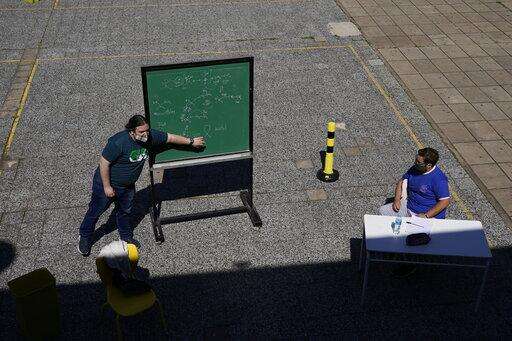FILE - In this Oct. 13, 2020 file photo, a teacher leads a lesson outdoors at the school Hipólito Yrigoyen in Buenos Aires, Argentina, on the first day since the COVID-19 pandemic outbreak that in-person classes in the capital for students in their last year of primary and secondary school were restarted, but outdoors. Argentina reached 1 million confirmed coronavirus cases on Monday, Oct. 19, 2020, according to the Ministry of Health. (AP Photo/Victor R. Caivano, File) The Associated Press