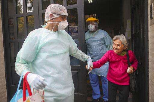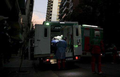 FILE - In this April 22, 2020 file photo, medical staff evacuate an elderly woman from a nursing home after multiple residents of the facility tested positive for the COVID-19 coronavirus in Buenos Aires, Argentina. Argentina reached 1 million confirmed coronavirus cases on Monday, Oct. 19, 2020, according to the Ministry of Health. (AP Photo/Natacha Pisarenko, File) The Associated Press