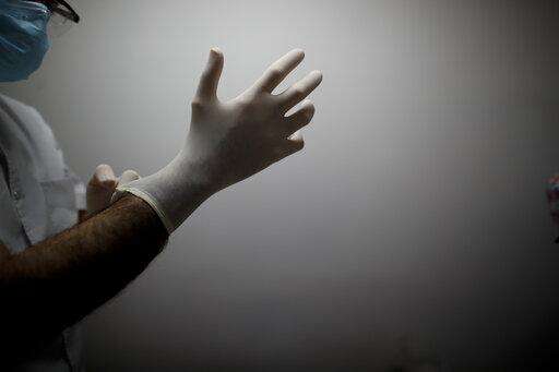 FILE - In this July 18, 2020 file photo, Dr. Matias Norte pulls on rubber gloves at a hospital during a government-ordered lockdown to curb the spread of the new coronavirus in Buenos Aires, Argentina. Argentina reached 1 million confirmed coronavirus cases on Monday, Oct. 19, 2020, according to the Ministry of Health. (AP Photo/Natacha Pisarenko, File) The Associated Press
