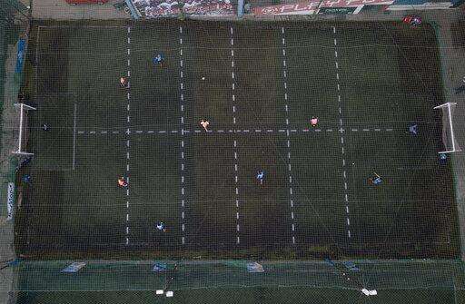 FILE - In this July 1, 2020 file photo, men play soccer at a local club, Play Futbol 5, in Pergamino, Argentina, where the club divided its soccer field into 12 rectangles to mark limited areas for each player, keeping them from making physical contact amid the COVID-19 pandemic. Argentina reached 1 million confirmed coronavirus cases on Monday, Oct. 19, 2020, according to the Ministry of Health. (AP Photo/Natacha Pisarenko, File) The Associated Press