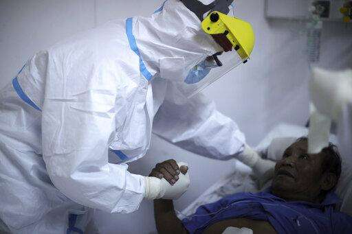 FILE - In this July 18, 2020 file photo, Dr. Matias Norte comforts a patient infected with COVID-19 at a hospital in Buenos Aires, Argentina. People are on edge in Argentina, where the number of new coronavirus cases is surging despite nearly five months of strict limits on movement and activities in Buenos Aires and the surrounding area. Argentina reached 1 million confirmed coronavirus cases on Monday, Oct. 19, 2020, according to the Ministry of Health. (AP Photo/Natacha Pisarenko, File) The Associated Press