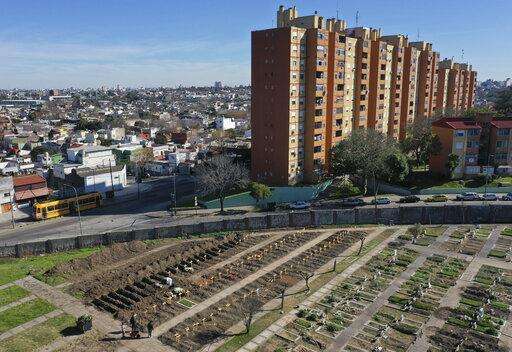 FILE - In this July 25, 2020 file photo, wooden crosses mark freshly dug graves at the Flores cemetery where people who died from the coronavirus are buried in Buenos Aires, Argentina. Argentina reached 1 million confirmed coronavirus cases on Monday, Oct. 19, 2020, according to the Ministry of Health. (AP Photo/Gustavo Garello, File) The Associated Press