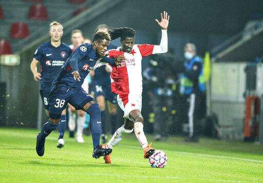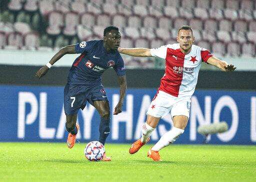 FILE - In this Wednesday, Sept. 30 2020 file photo, FC Midtjylland's Frank Onyeka, left, vies for the ball with Slavia Prague's Peter Olayinka during the Champions League play off qualifier soccer match between FC Midtjylland and Slavia Prague at MCH Arena in Herning, Denmark. FC Midtjylland has been one of the poster teams for analytics in European soccer. Now the Danish club is about to find out how its data-driven and statistical approach fares in the Champions League after qualifying for the competition's group stage for the first time. (Henning Bagger/Ritzau Scanpix via AP, File) The Associated Press