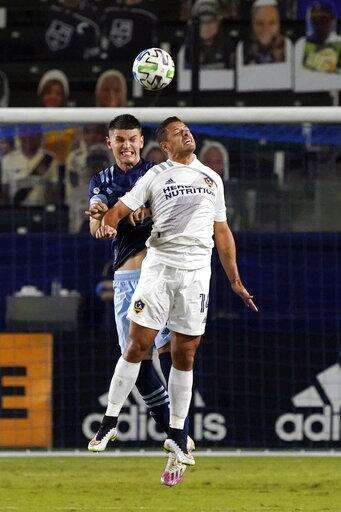 Los Angeles Galaxy's Javier Hernandez, front, goes up for a header as Vancouver Whitecaps's Ranko Veselinovic defends during the second half of an MLS soccer match, Sunday, Oct. 18, 2020, in Carson, Calif. (AP Photo/Marcio Jose Sanchez)
