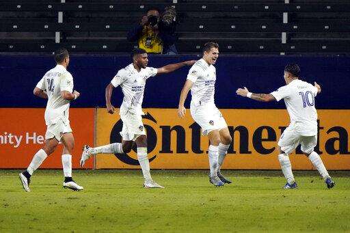 Los Angeles Galaxy's Kai Koreniuk, second from right, celebrates his goal with teammates during the second half of an MLS soccer match against the Vancouver Whitecaps, Sunday, Oct. 18, 2020, in Carson, Calif. (AP Photo/Marcio Jose Sanchez)