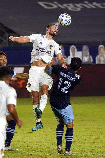 Los Angeles Galaxy's Perry Kitchen, top, heads the ball over Vancouver Whitecaps's Fredy Montero (12) during the second half of an MLS soccer match, Sunday, Oct. 18, 2020, in Carson, Calif. (AP Photo/Marcio Jose Sanchez)