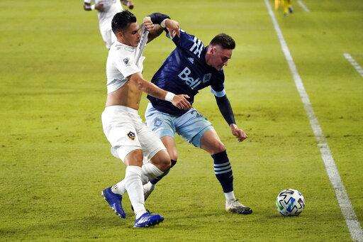 Vancouver Whitecaps's Jake Nerwinski, right, works against Los Angeles Galaxy's Cristian Pavon during the first half of an MLS soccer match, Sunday, Oct. 18, 2020, in Carson, Calif. (AP Photo/Marcio Jose Sanchez)