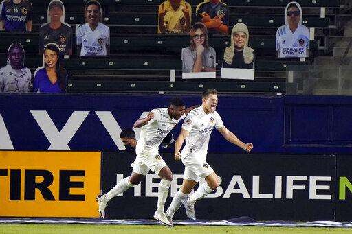 Los Angeles Galaxy's Kai Koreniuk, right, celebrates as he scores a goal during the second half of an MLS soccer match against the Vancouver Whitecaps, Sunday, Oct. 18, 2020, in Carson, Calif. (AP Photo/Marcio Jose Sanchez)