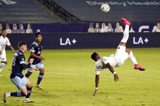 Los Angeles Galaxy's Yony Gonzalez, right, takes a shot on goal with a scissor kick during the first half of an MLS soccer match against the Vancouver Whitecaps, Sunday, Oct. 18, 2020, in Carson, Calif. (AP Photo/Marcio Jose Sanchez)