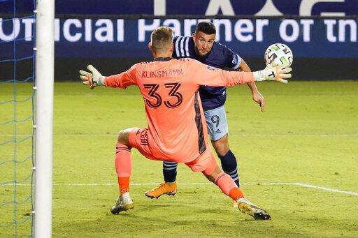 Los Angeles Galaxy goalkeeper Jonathan Klinsmann (33) stops a shot from Vancouver Whitecaps's Lucas Cavallini during the second half of an MLS soccer match, Sunday, Oct. 18, 2020, in Carson, Calif. (AP Photo/Marcio Jose Sanchez)