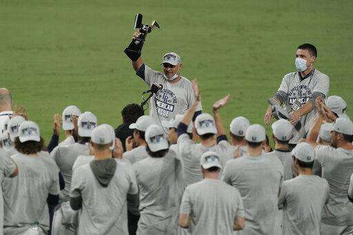 Tampa Bay Rays manager Kevin Cash holds the American League championship trophy following their victory against the Houston Astros in Game 7 of a baseball American League Championship Series, Saturday, Oct. 17, 2020, in San Diego. The Rays defeated the Astros 4-2 to win the series 4-3 games. (AP Photo/Ashley Landis) The Associated Press