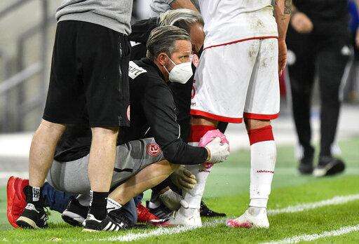 FILE-In this May 27, 2020 file photo a player gets treatment by a physio with a face mask during the German Bundesliga soccer match between Fortuna Duesseldorf and FC Schalke 04 in Duesseldorf, Germany. Bundesliga clubs are sounding the alarm over players returning from international duty with the coronavirus as Germany's daily infection rate continues to rise. (AP Photo/Martin Meissner) The Associated Press