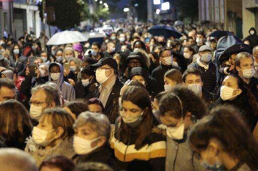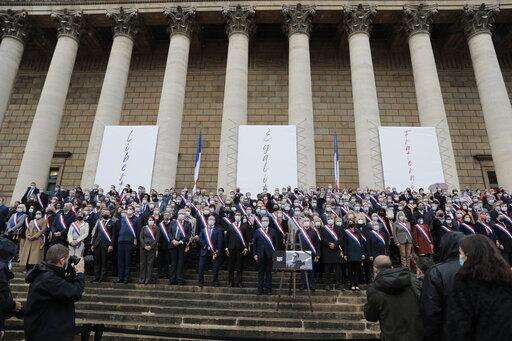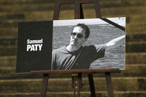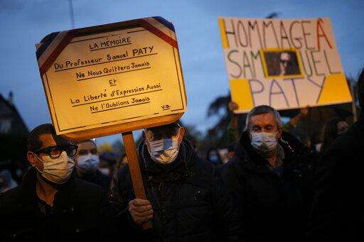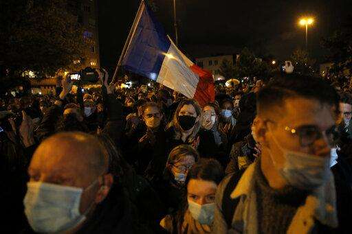 Meanwhile, more than 1,000 people gathered in drizzly rain to honor Samuel Paty where he was beheaded Friday as he left school in Conflans-Sainte-Honorine, northwest of Paris. Bouquets of flowers were piled in front of the school.
