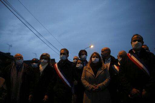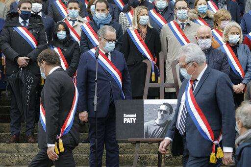 French officials lead a memorial march in homage to the history teacher who was beheaded last week, Tuesday, Oct.20, 2020 in Conflans-Sainte-Honorine, northwest of Paris. Samuel Paty was beheaded on Friday by an 18-year-old Moscow-born Chechen refugee, who was later shot dead by police. Police officials said Paty had discussed caricatures of Islam's Prophet Muhammad with his class, leading to threats. (AP Photo/Lewis Joly)