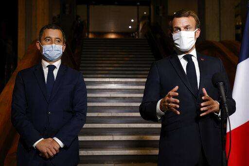 French President Emmanuel Macron, right, delivers a speech while Interior Minister Gerald Darmanin listens, after a visit on the fight against separatism at the Seine Saint Denis prefecture headquarters in Bobigny, a northeastern suburbs of Paris, Tuesday Oct. 20, 2020. Authorities were looking into about 50 associations suspected of encouraging hate speech and the issue will be discussed at a Cabinet meeting Wednesday after the history teacher Samuel Paty was beheaded on Friday by an 18-year-old Moscow-born Chechen refugee. (Ludovic Marin, Pool via AP)